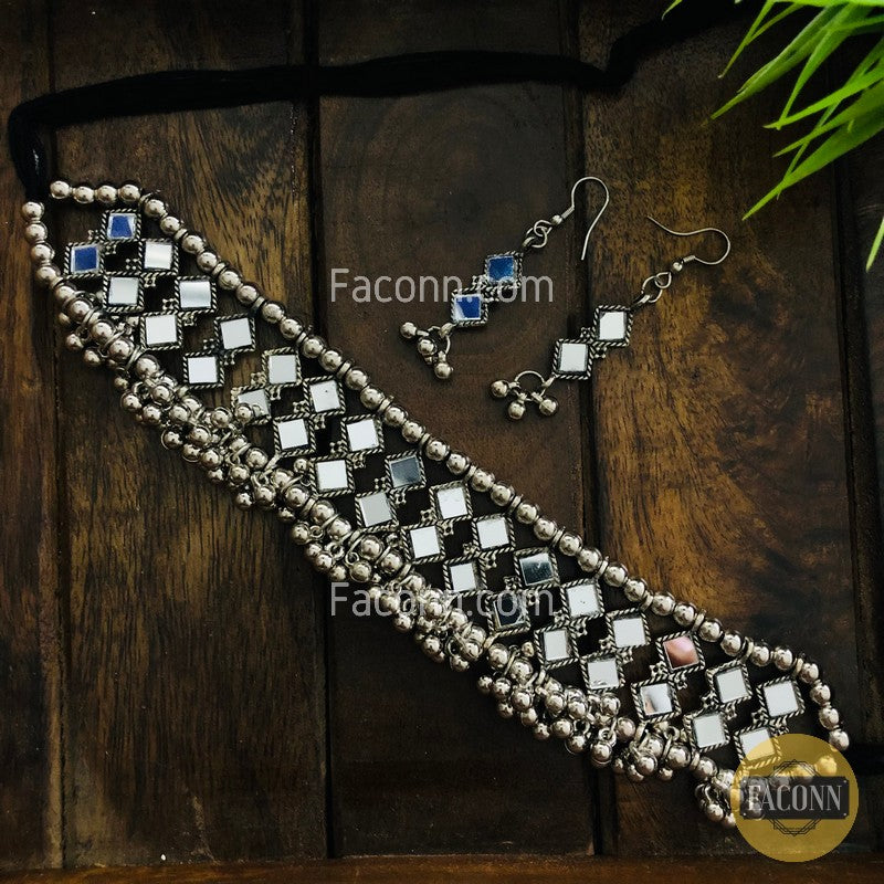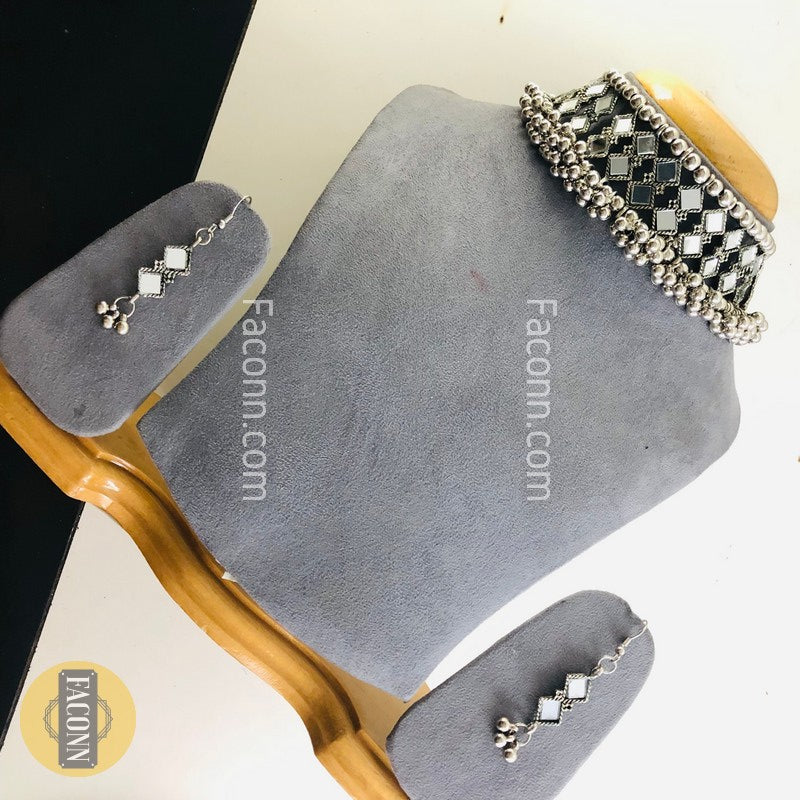 LARQ JEWELS Oxidized Silver Mirror Choker Necklace Set