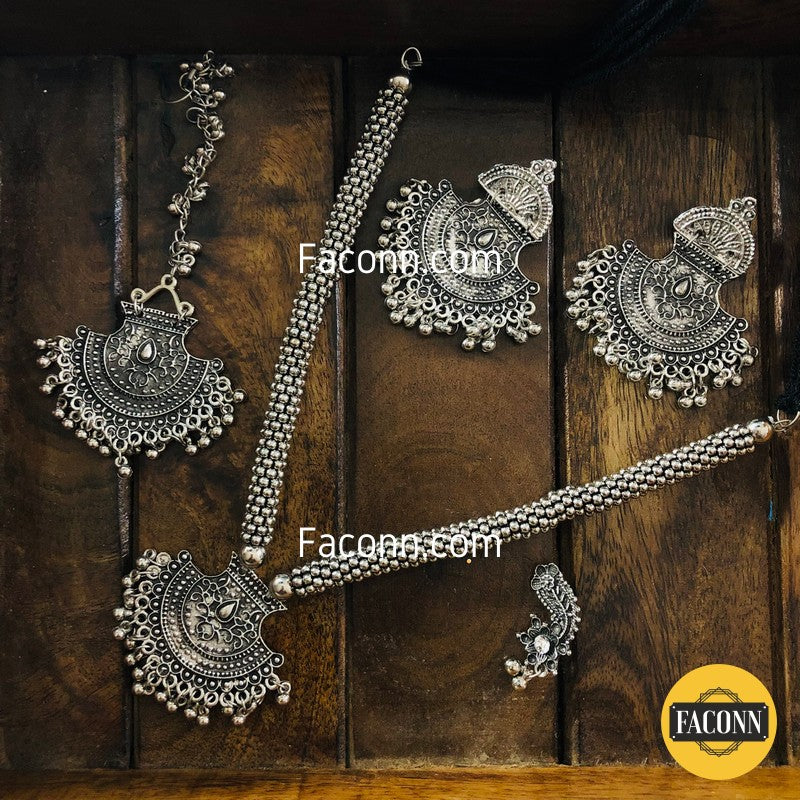 LARQ JEWELS Oxidized Silver tone Rustic Maang Tika Necklace Set