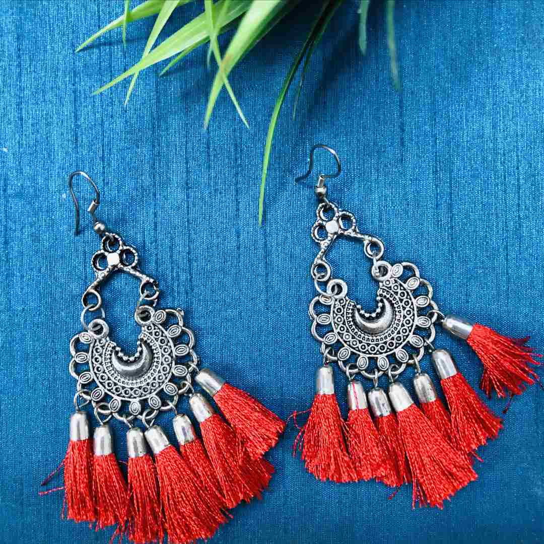 LARQ JEWELS Women's Pearl Embellished Red Color Silk Thread Oxidized Silver Jhumki