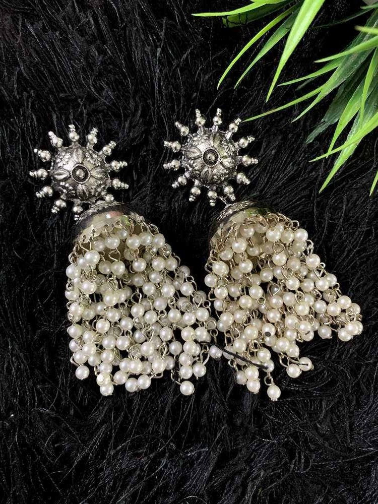 Oxidised Silver Traditional Earring With White Pearl Afghani Long Tassel Jhumka