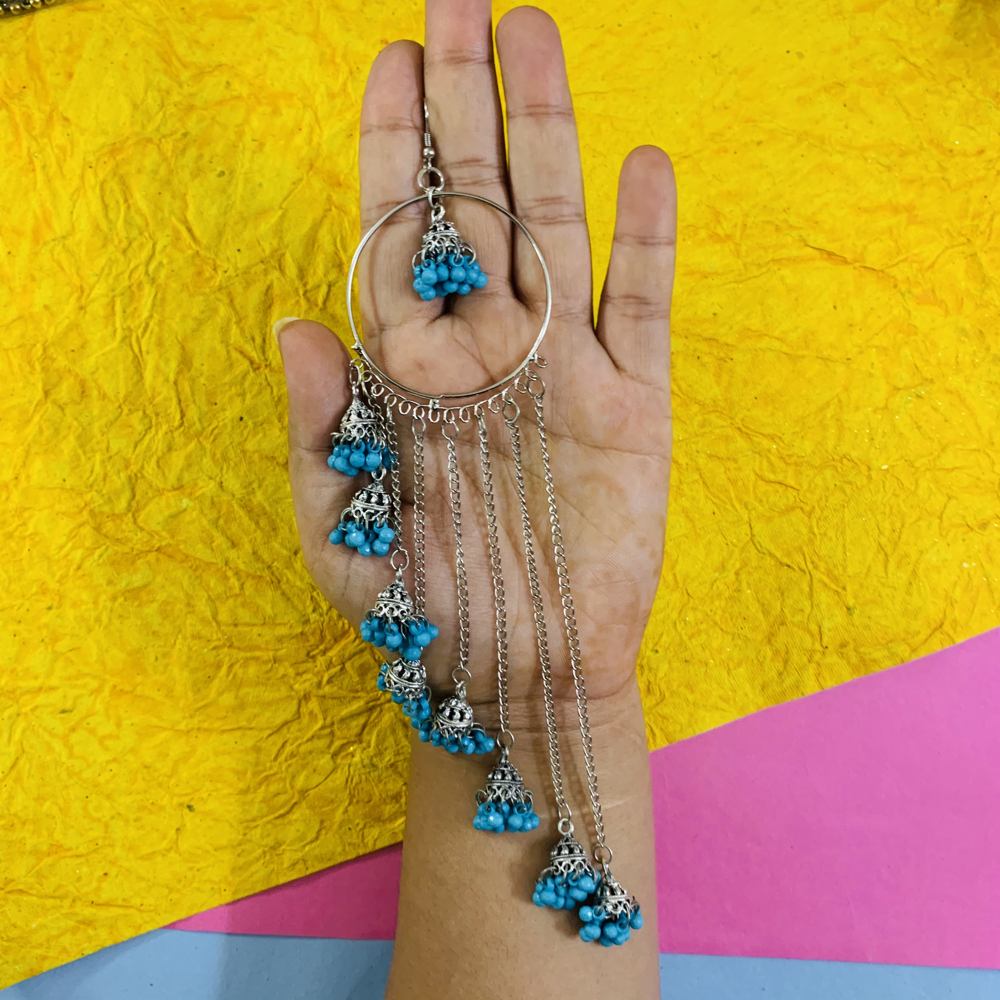 Traditional Silver Oxidised Hoop Multi Layer Chain Blue Jhumki Earrings