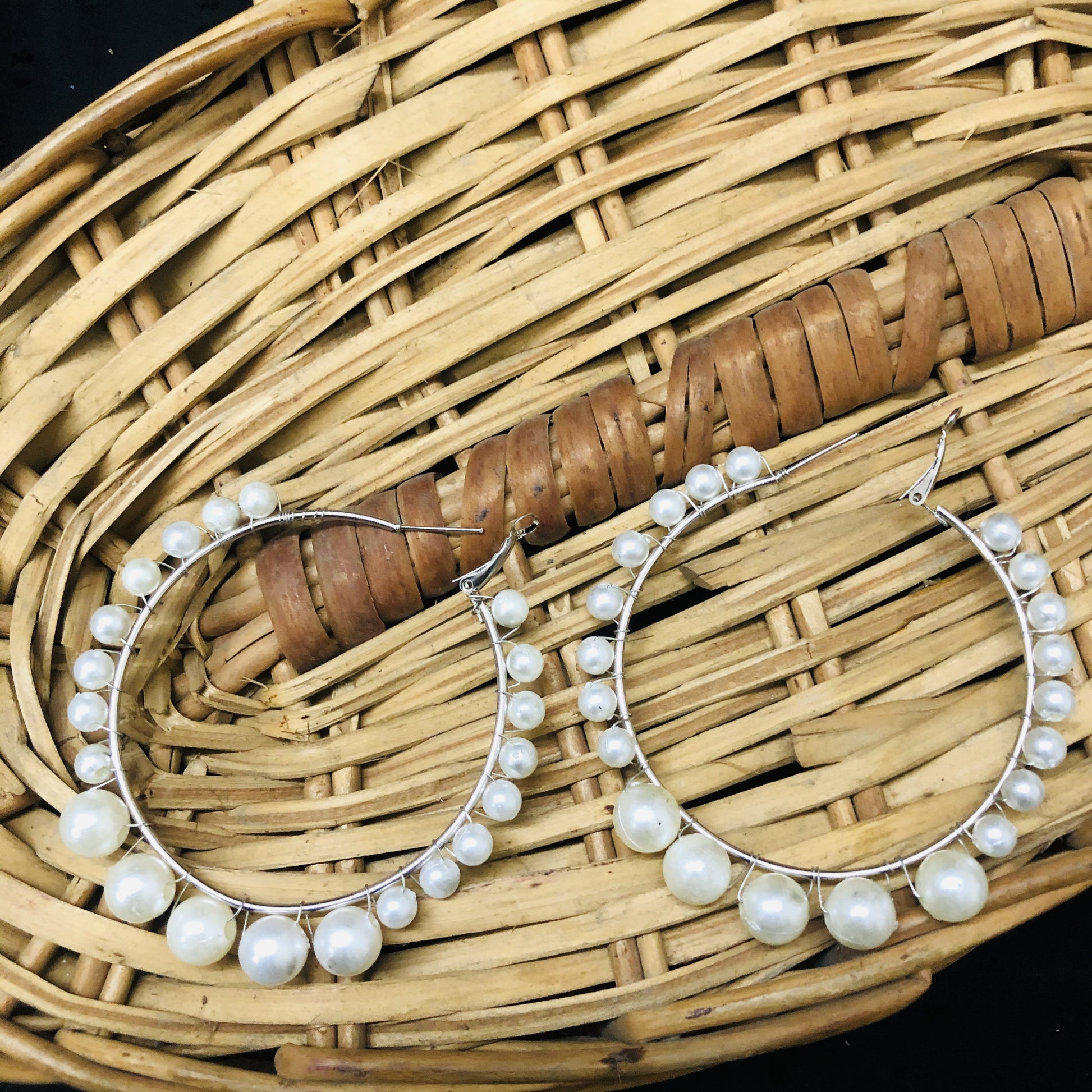 Vintage Large White Silver Pearl Hoop Earrings For Women